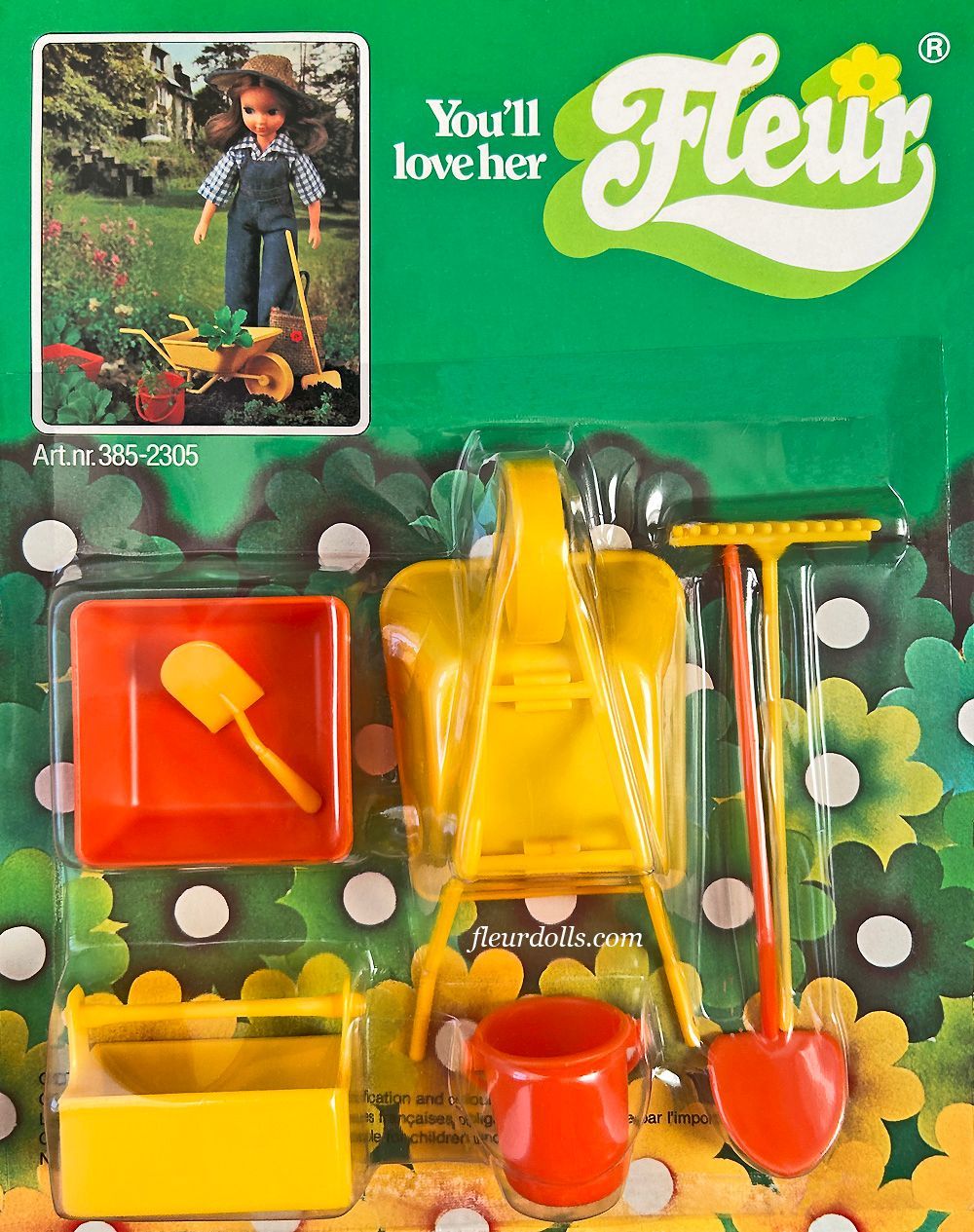 The first appearance of Fleur's garden tools is in the 1982 Speelboom catalogue. This is a beautiful tool set, very realistic and very well made. As you can see in photos below, the set is a mix of orange and yellow items, in two reverse-colour arrangements. The size is in perfect scale for Fleur.